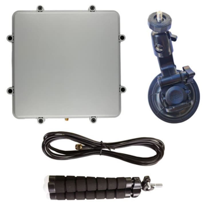 Antenneset met montagekit. Hiermee kun je de antenne eenvoudig hoog en buiten plaatsen, waar de ontvangst aanzienlijk verbetert. De dipoolvoet wordt bevestigd op een standaard 1/4″ cameraschroef, zodat deze op diverse reeds beschikbare houders kan worden gemonteerd. Inclusief een flexibel statief en zuignapbevestiging.