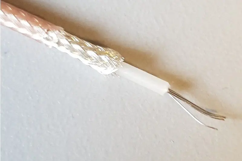 RG316, de ideale 50 Ohm coax voor interne bedradingen. De diameter is slechts 2,5 mm. Teflon isolatie, verzilverde afscherming en geleider.