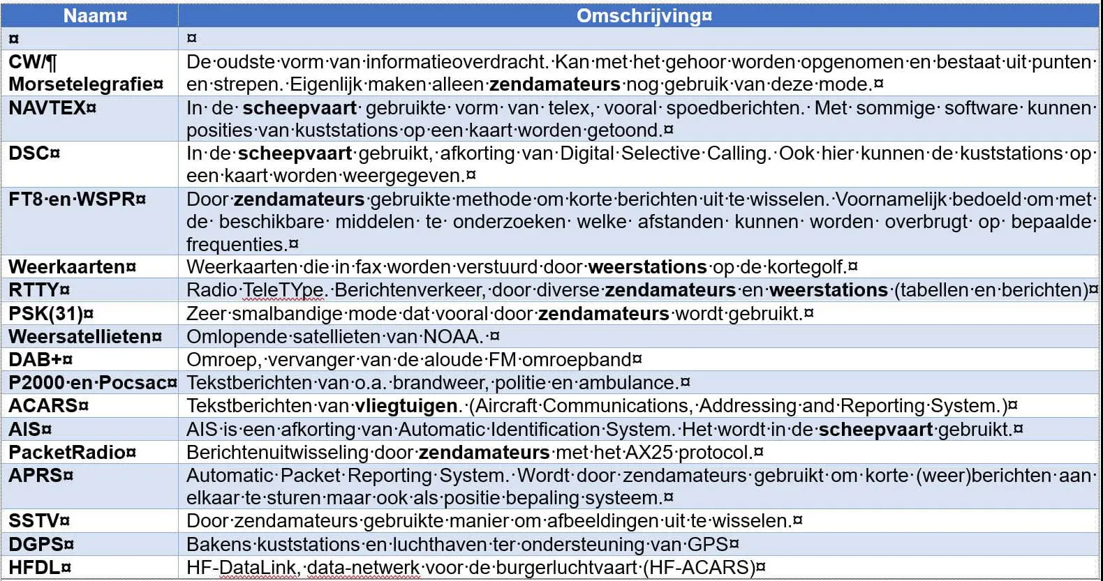 tabel algemene eigenschappen flexradio